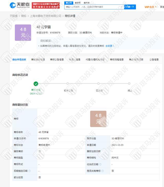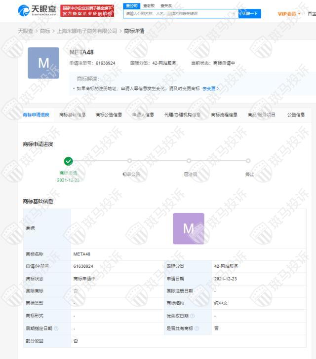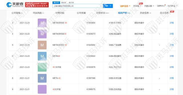 天眼查App显示,近日,丝芭传媒旗下上海米娜电子商务有限公司申请注册多个元宇宙相关商标,包括“48元宇宙”“META48”“四八元宇宙”等,国际分类包括啤酒饮料、教育娱乐等,目前商标状态均为申请中。