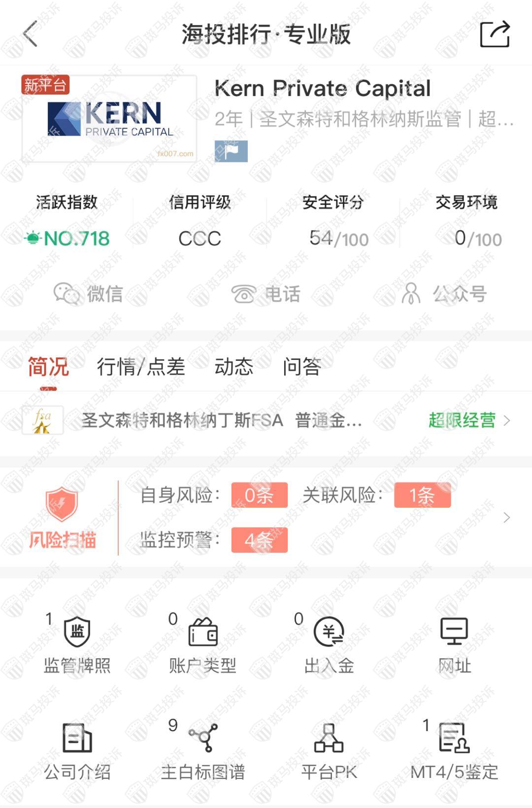 海投排行数据显示,Kern Private Capital成立于2020年,全球排名718位,排名很低,安全评分仅有54分,目前持有圣文森特和格林纳丁斯FSA牌照,但是这个牌照都没有经营外汇业务的资格,资金无法隔离监管,安全隐患较大。风险扫描20条,注意相关风险。