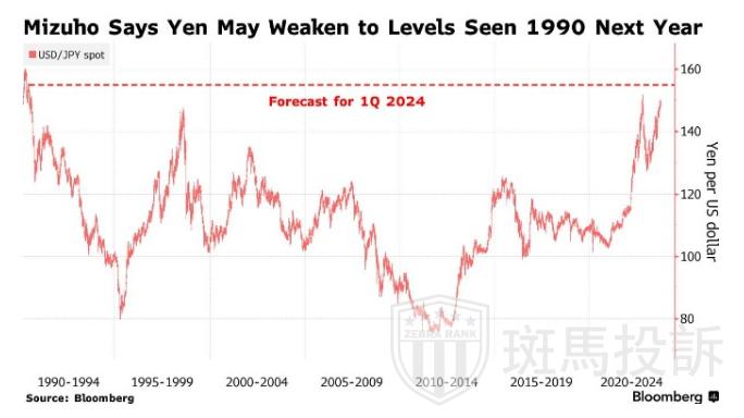 获悉,据日元最准确的预测机构瑞穗称,由于日本央行坚持其刺激性货币政策立场,日元正跌向30多年来的最低水平。