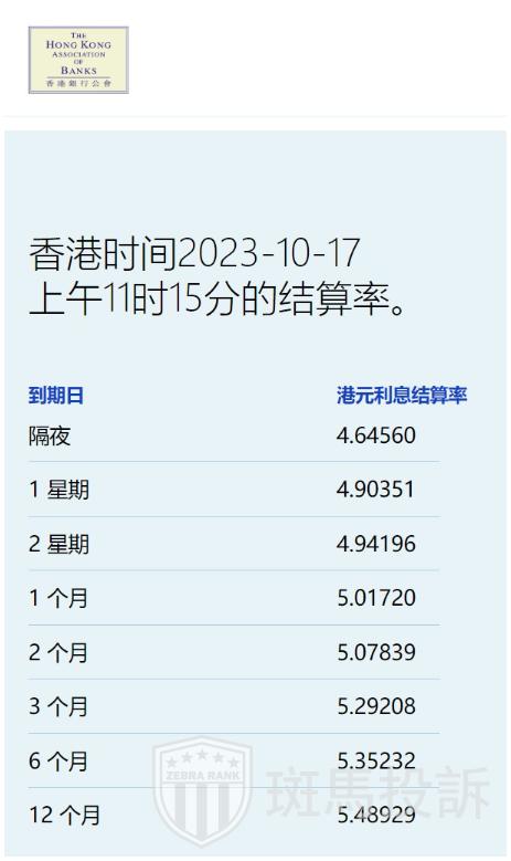 10月17日,港元(7.8219,0.0051,0.07%)拆息全线上扬,其中,与楼按相关的一个月拆息两连升,重上5%水平,报5.01720%,反映银行资金成本的三个月拆息连升三天,报5.29208%,创三周新高,与同期美元LIBOR息差收窄37基点。隔夜息回升至4.64560%,一周钱报4.90351%。长息方面,六个期及一年期分别反弹至5.35232%及5.48929%。