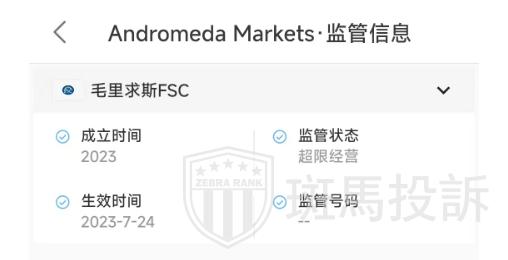 Andromeda Markets平台据查询在毛里求斯FSC注册,该平台官网提供的许可证号在毛里求斯FSC查无信息,非官方监管证号,只能证明平台确实有在毛里求斯FSC注册,但尚未取得监管,并且毛里求斯FSC只是离岸监管,效能不强,用户应谨慎选择。