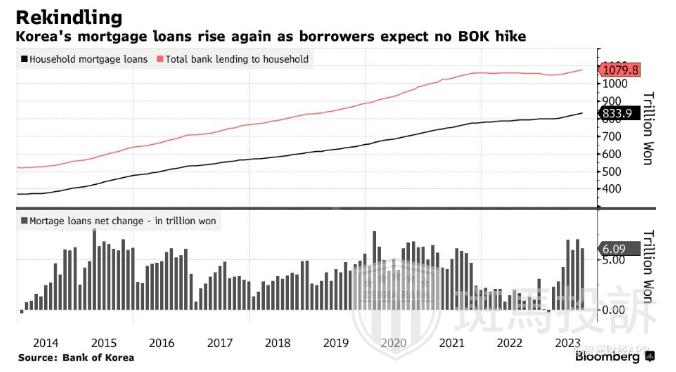 韩国央行数据显示,截至9月底,韩国家庭债务达到创纪录的1,079.8万亿韩元(合7980亿美元),抵押贷款增幅为2020年2月以来最大。韩国央行行长李昌镛敦促潜在的购房者要意识到,利率居高不下的时间可能比预期的要长。