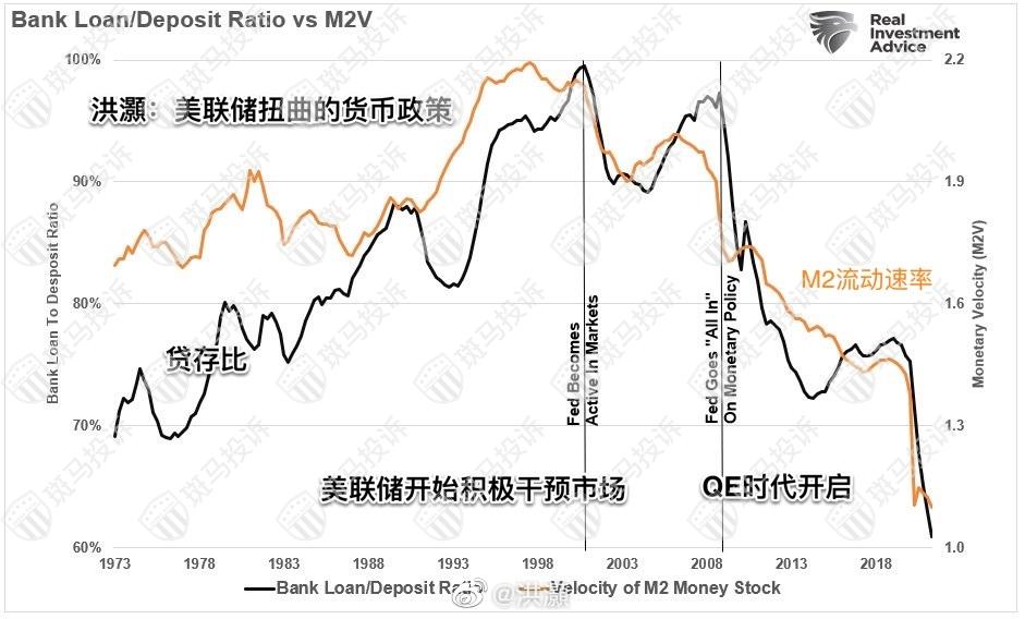 斑马投诉讯,美国广义货币流通速度暴跌到历史新低,贷存比亦然。美联储越干预,货币环境越扭曲。现代货币学派认为货币流动速率低就没有通胀。然而在70年代初,当时非常低的M2流动速率和贷存比也没有避免后来70年代的大通胀。货币流动速率的崩塌是货币政策扭曲的表现。不知道这回如何收场?