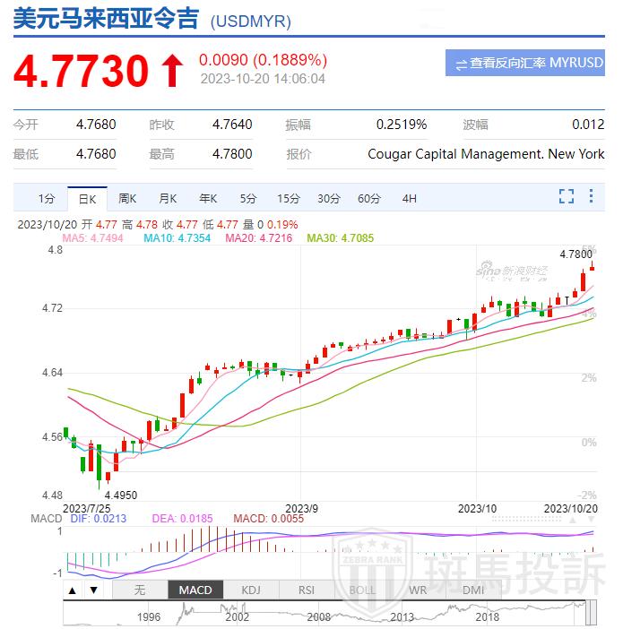 鉴于马来西亚与美国的利差扩大导致货币承压,林吉特汇率周四(10月19日)一度重贬至4.7710,收市报在4.7680,写下亚洲金融风暴以来最低收市水平。