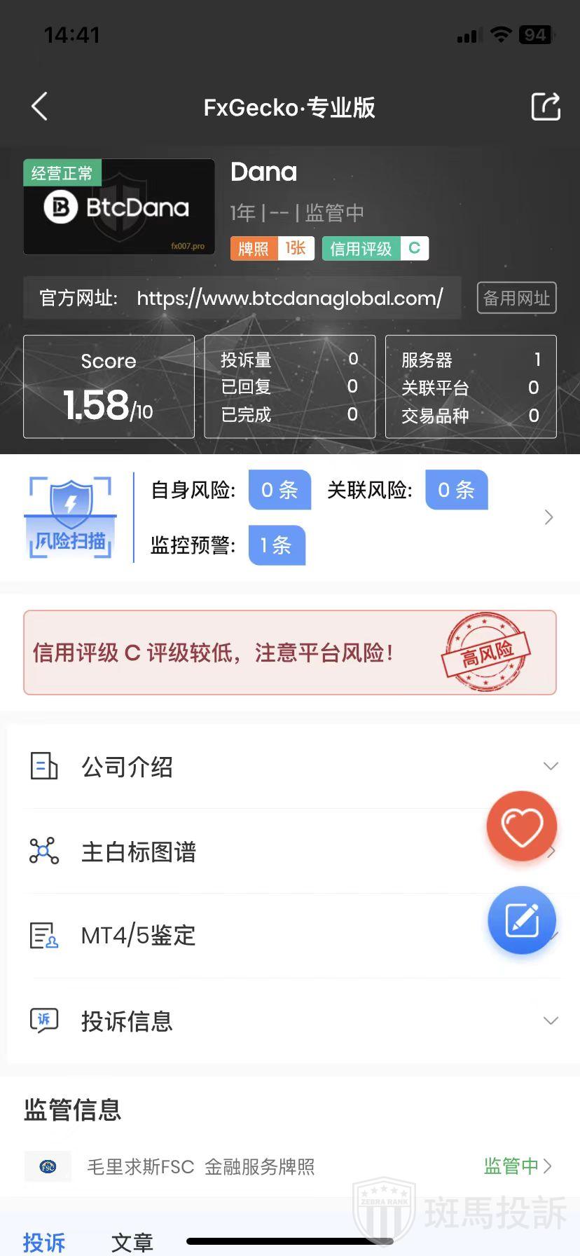 Dana,在FxGecko显示1家监管信息。持有的毛里求斯FSC金融服务牌照监管状态为正在监管中。