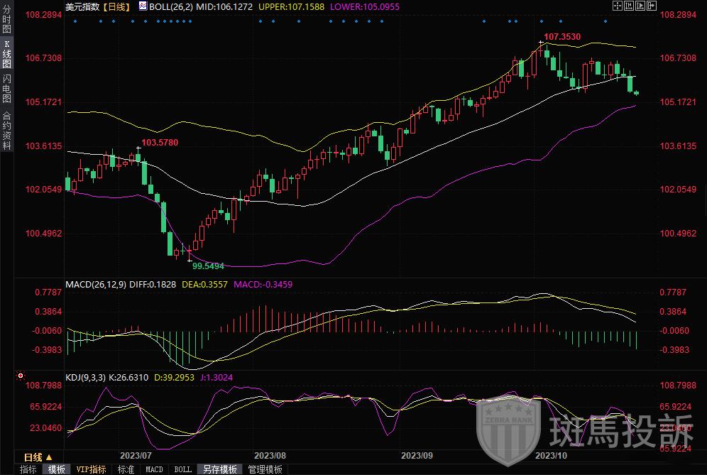 EC Markets报道:周二(10月24日)亚市盘中,随着美债收益率下滑,美元指数(105.4607,-0.1397,-0.13%)维持日内跌势,目前交投在105.50附近。