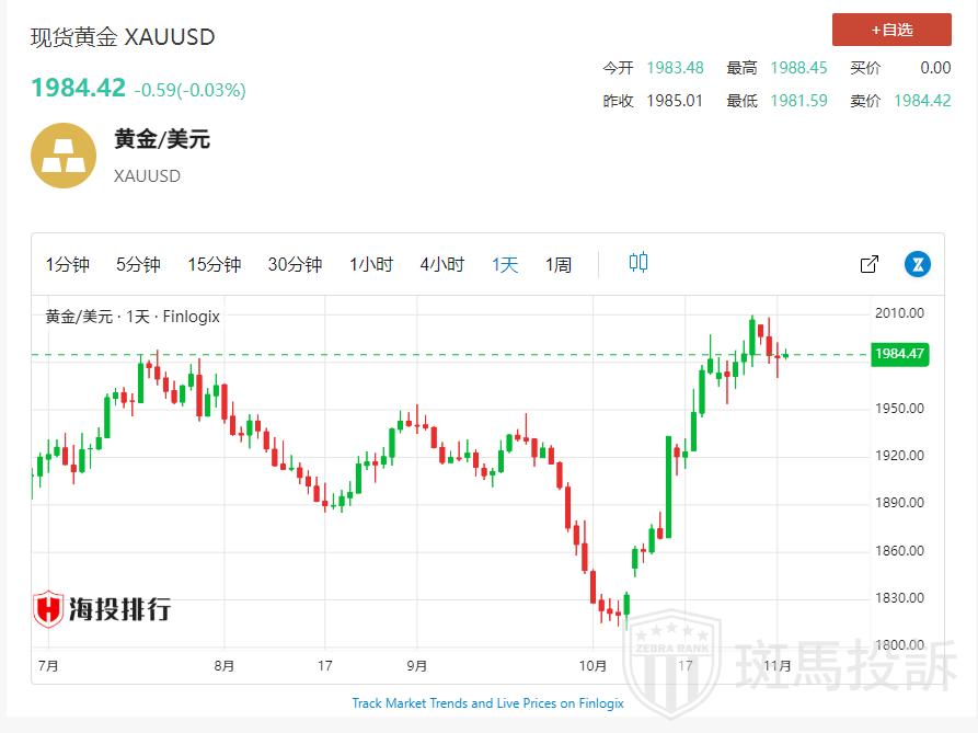 现货黄金日线图北京时间11月2日11:40现货黄金报1984.42美元/盎司