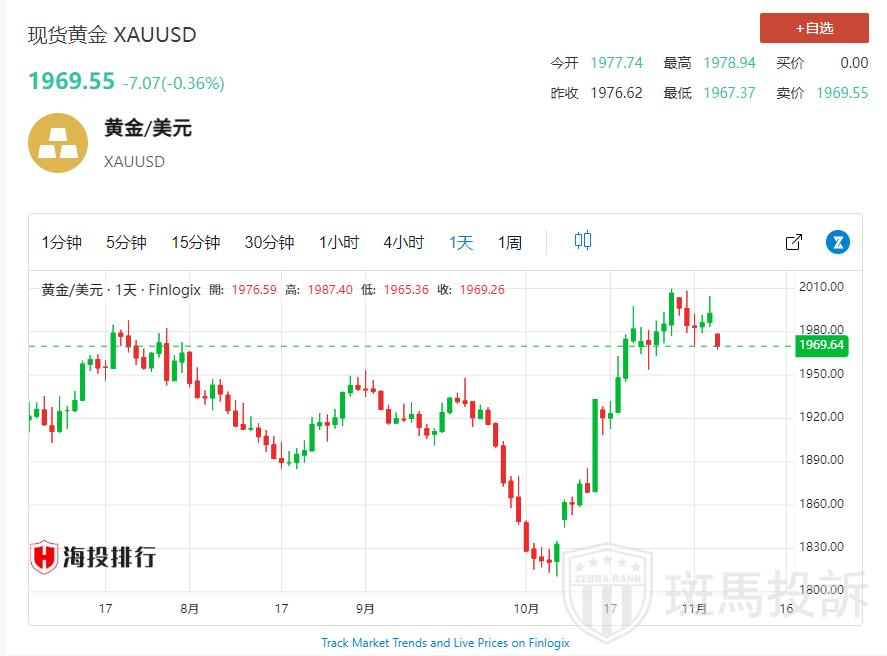 现货黄金周一收市重挫14.54美元,跌幅0.73%,报1977.78美元/盎司。