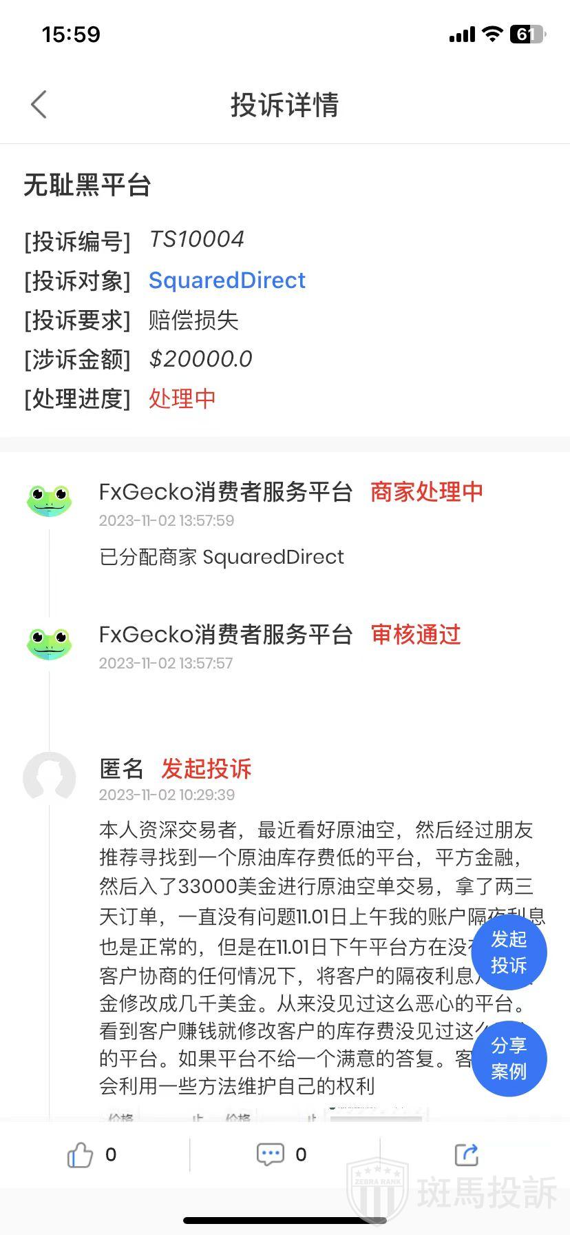 最近,有投资者通过FxGecko APP投诉无耻黑平台SquaredDirect私自修改客户的隔夜利息。