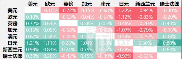 下表显示了本周日元兑主要货币对价格波动百分比。日元对美元汇率最强。