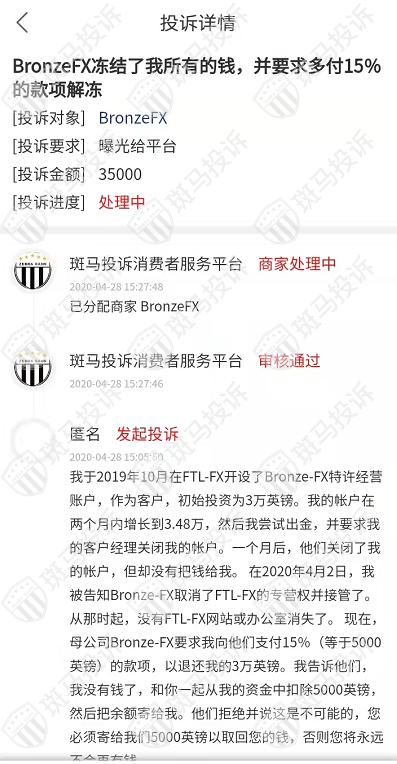 据投诉者反馈,BronzeFX冻结了该投资者的所有资金,并要求他另外支付15%的款项进行解冻。该投资者于2019年10月在FTL-FX开设了Bronze-FX特许经营账户,作为客户,初始投资为3万英镑。其帐户在两个月内增长到3.48万,然后尝试出金,并要求客户经理关闭他的帐户。一个月后,他们关闭了该投资者的帐户,但却没有把钱给他。在2020年4月2日,该投资者被告知Bronze-FX取消了FTL-FX的专营权并接管了。Bronze-FX要求该投资者向他们支付15%(差不多5000英镑)的款项,以退还他的3万英镑。该投资者让他们从他的3万资金中扣除5000英镑,然后把余额退给他。但是被平台拒绝了,平台称该投资者必须支付5000英镑以取回自己的资金,否则他的钱永远取不出。