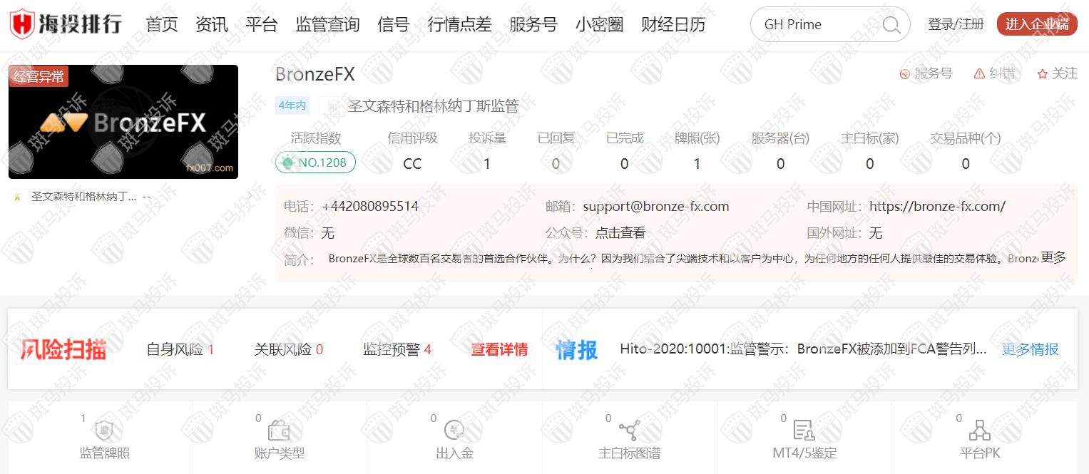 据海投排行资料显示,BronzeFX平台成立于2018年,全球排名1208名,目前经营异常,无监管,没有外汇牌照,不能做外汇保证金交易,风险扫描显示4条风险,投资者资金安全无保障。