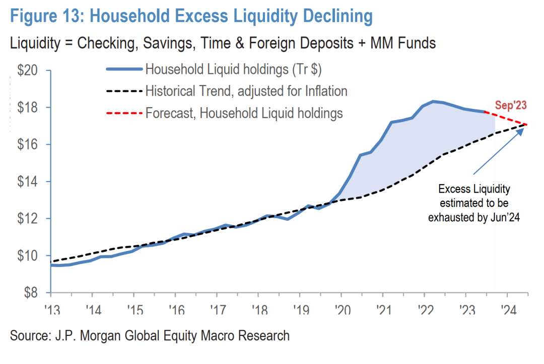 超额储蓄从3.4万亿美元降到了1万亿,经通胀调整数据来看只有头部20%还有富余,中产和底层已经回到疫情前水平,没余粮了。