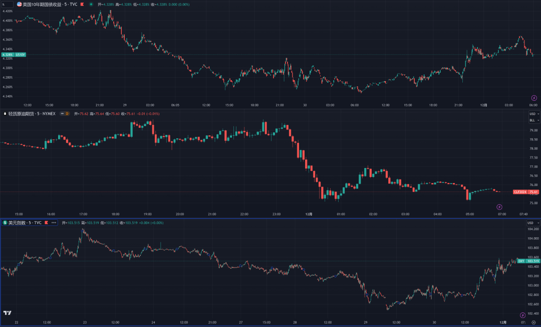 图(上):10年期美债收益率对通胀数据脱敏,回升至4.3%以上的水平图(中):原油价格在OPEC+会议结果公布后下跌图(下):美元指数强势反弹