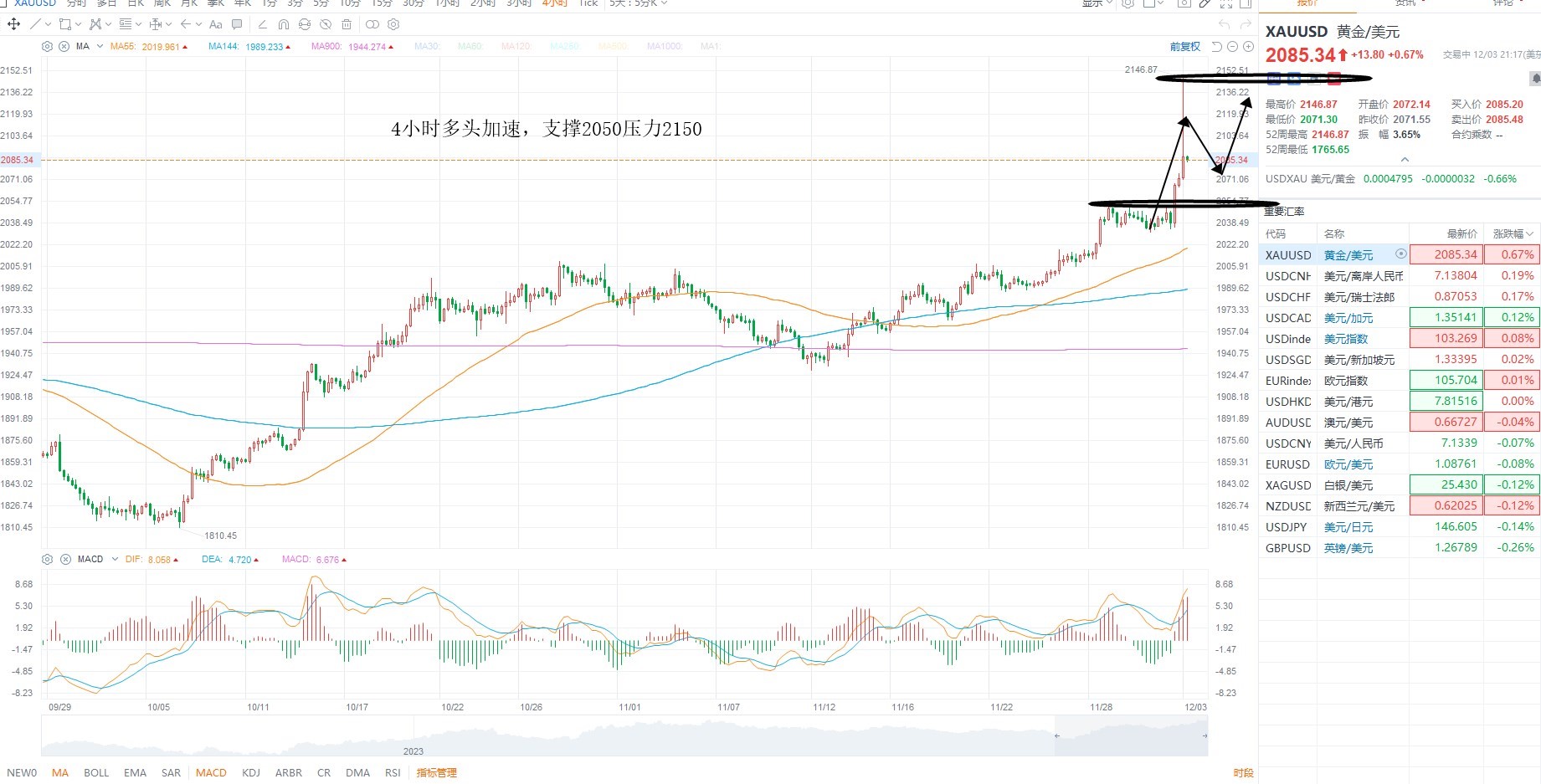 黄金短期加速走高,主要是地缘局势,叠加美联储降息预期提前,转换层金价走强,不过大幅走高之后存在回踩需求,且目前波动率增加,考虑到美元指数并未出现破位迹象,因此日内等待金价回踩为主,4小时级别多空分水岭2050附近,上方压力2150