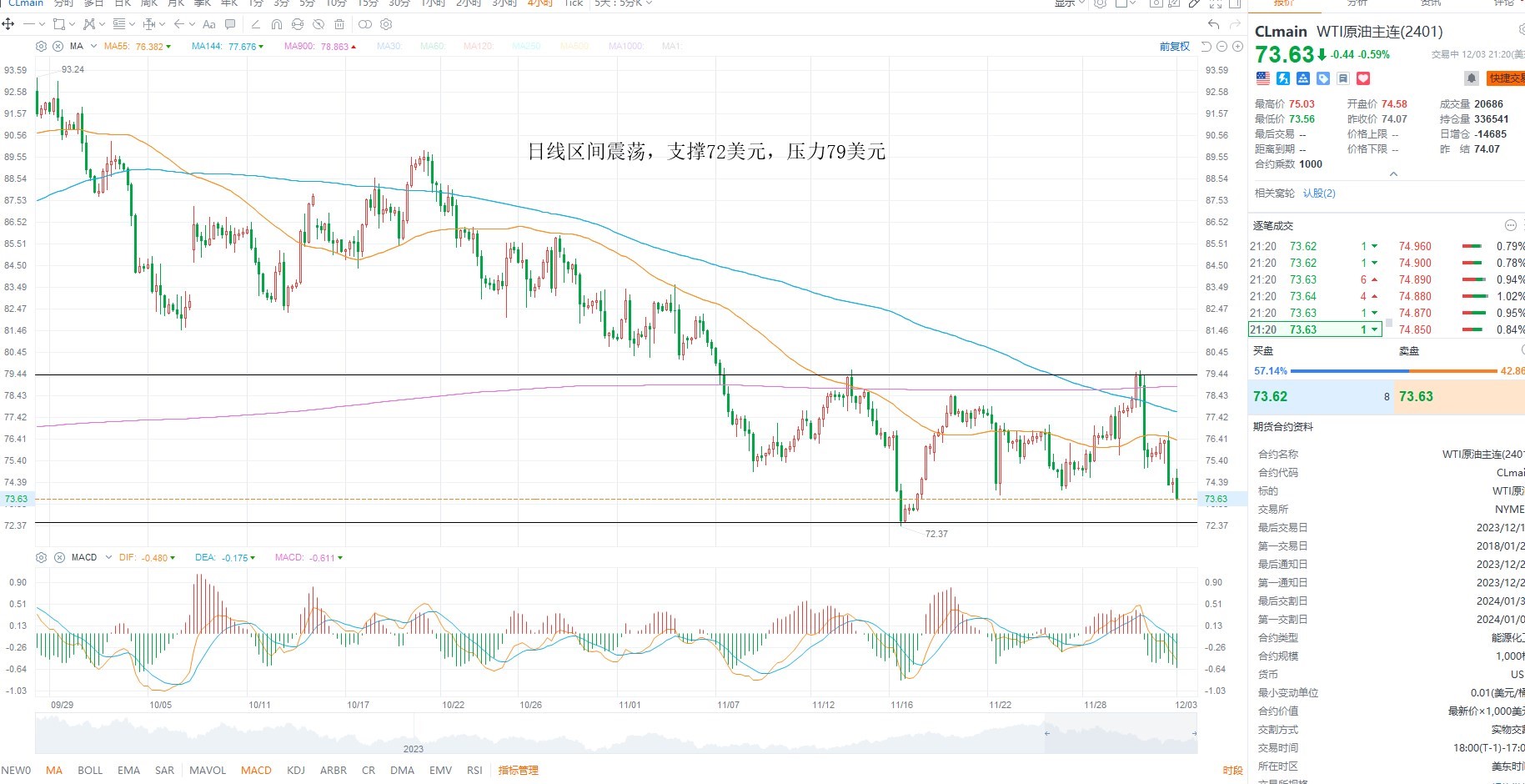 美原油跌破收敛支撑,短期测试箱体下沿,目前基本面上需求端压力限制了油价的反弹,而供给端同步走弱,使得油价低位盘整,继续关注供需变化之后的方向选择,日线级别多空分水岭72美元附近,上方压力79美元附近