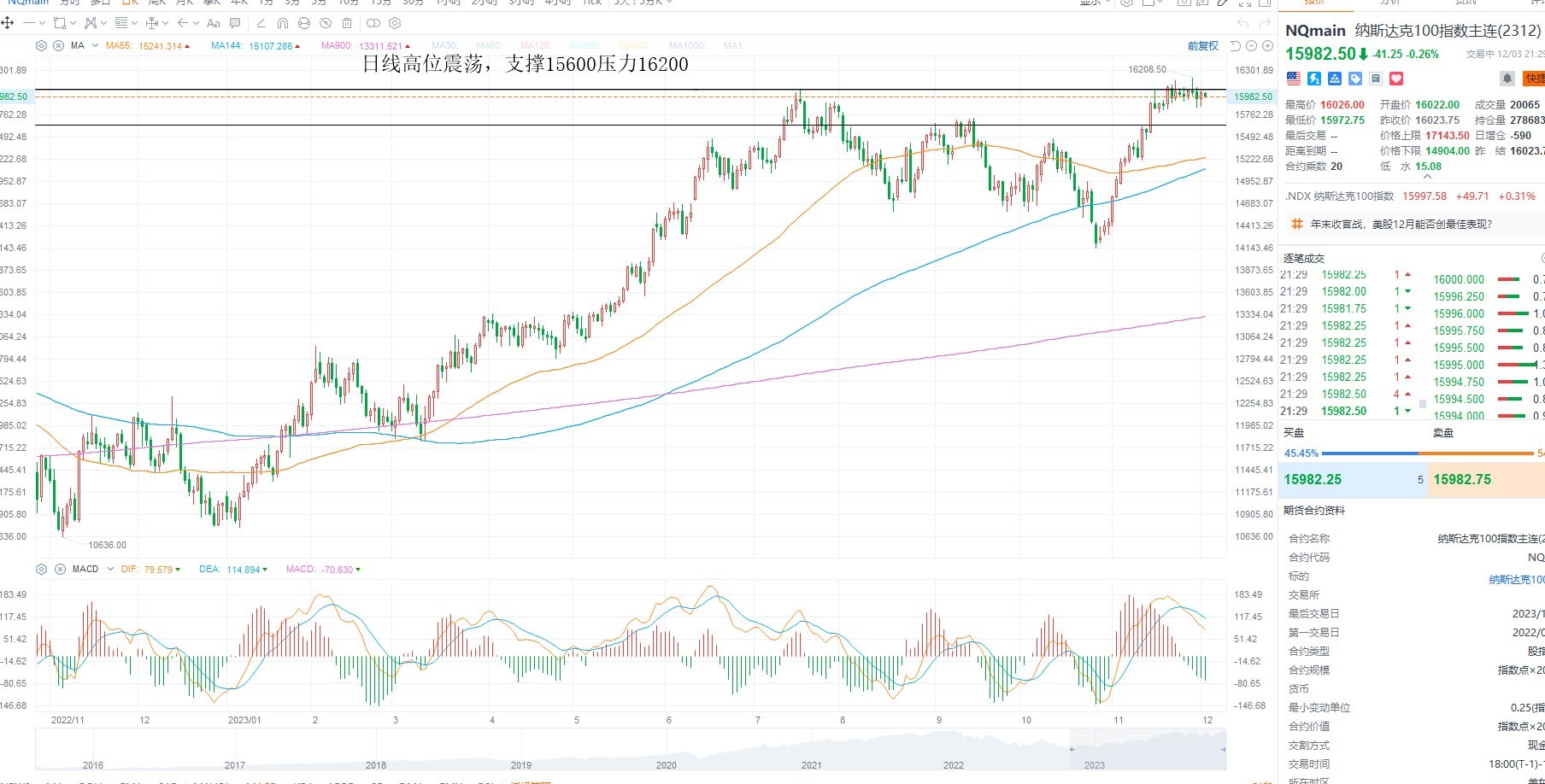 纳斯达克指数维持高位震荡,目前风偏下行,整体结构并未突破前期高点,基本面上美联储降息预期提前,但业绩增速下行也是短期存在的隐患,因此结构上需要等待箱体压力突破,日内高抛低吸为主,上方压力16200附近,下方支撑15600