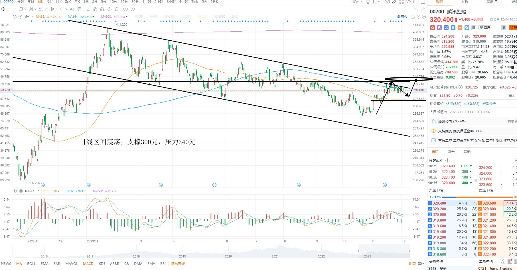腾讯控股短期依然在压力位置附近盘整,基本面上需要进一步的流动性回暖才有可能形成共振突破,但指数左侧区间尚未突破,因此等待权重共振为主,日线级别多空分水岭340元附近,下方支撑300元附近