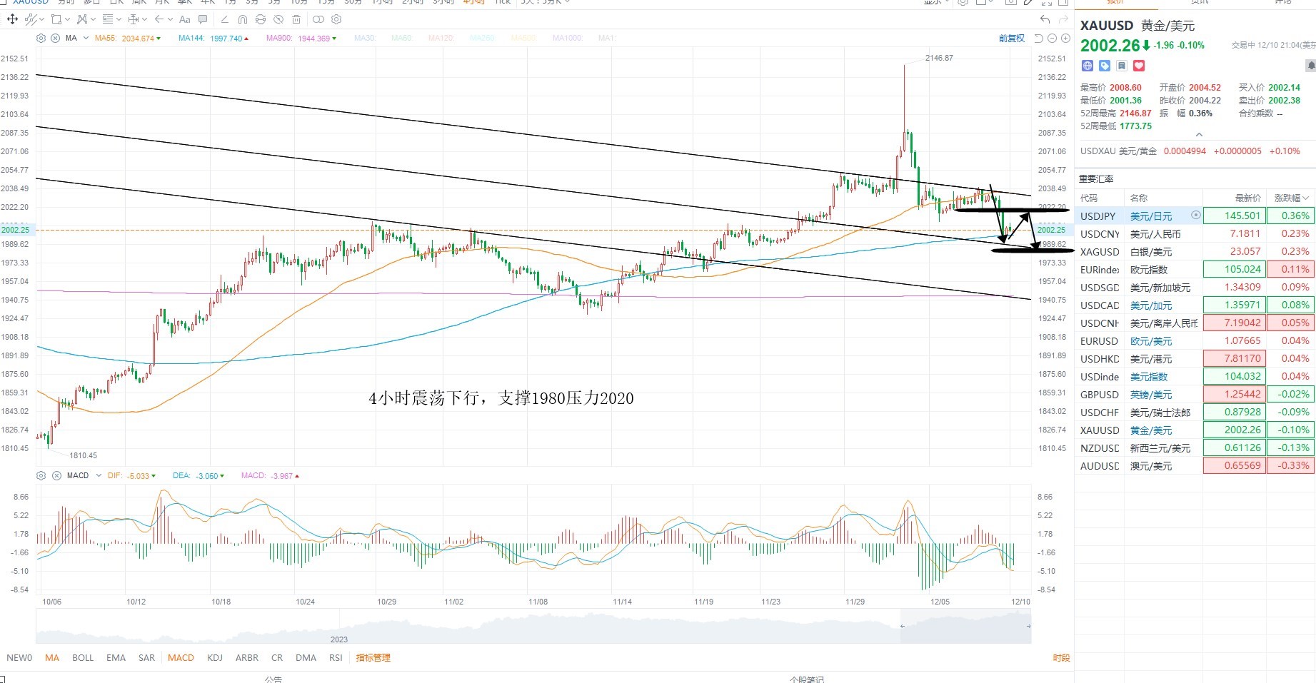 黄金短期继续震荡下行,且结构上存在破位的可能性,但中期依然是多头上行,创历史新高之后多头获利了结,同时非农数据好于预期,市场对于宽松预期下行,施压金价,虽然美元指数并未大幅走强,但修正结构没有改变,日内等待金价企稳为主,4小时级别中轴线支撑1980附近,上方压力2020附近