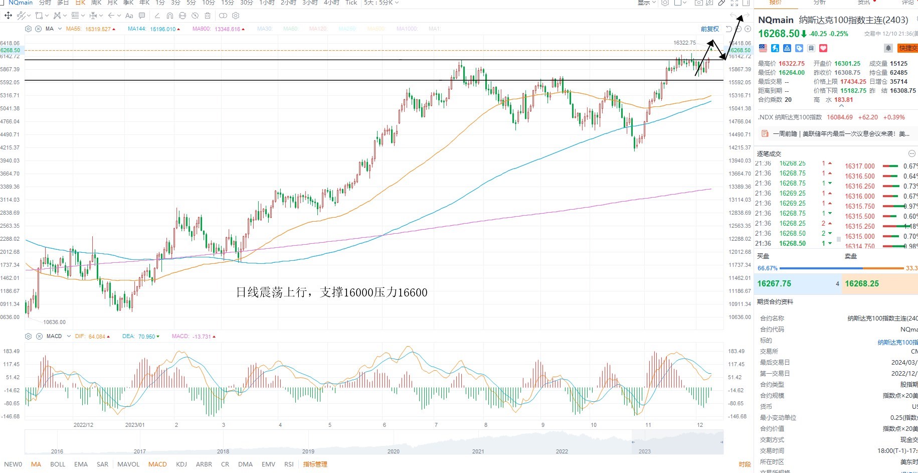 纳斯达克指数再创新高,虽然非农数据好于预期,但市场风偏并未进一步下行,反而对于软着陆的预期升温,支撑估值分子端上行,不过目前尚未确认突破有效,依然偏震荡上行为主,日线级别回踩支撑16000附近不破,则等待低吸,上方密集压力区间16600附近