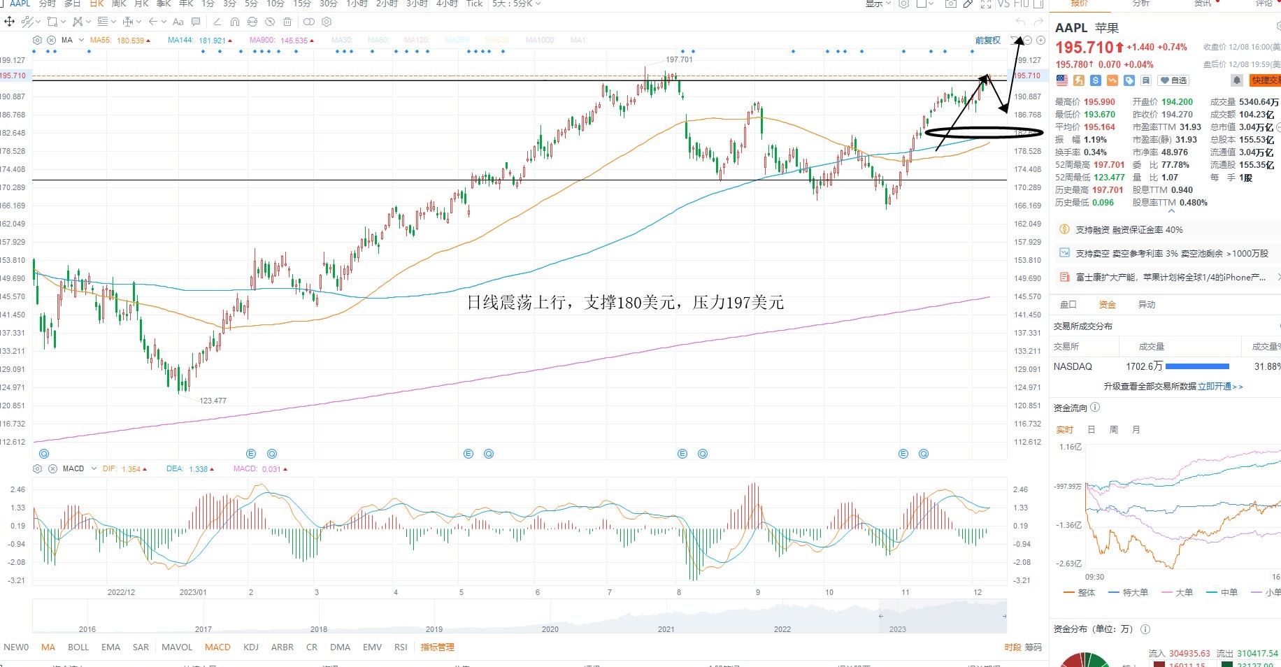 AAPL短期依然在压力位置附近盘整,虽然指数创新高,但是AAPL并未跟随,结构上分子端压力依然很大,因此日内不宜过分追涨,等待确认突破为主,短期均线偏离值较大,日内回踩支撑180美元附近,等待低吸,上方压力前期高点197美元附近