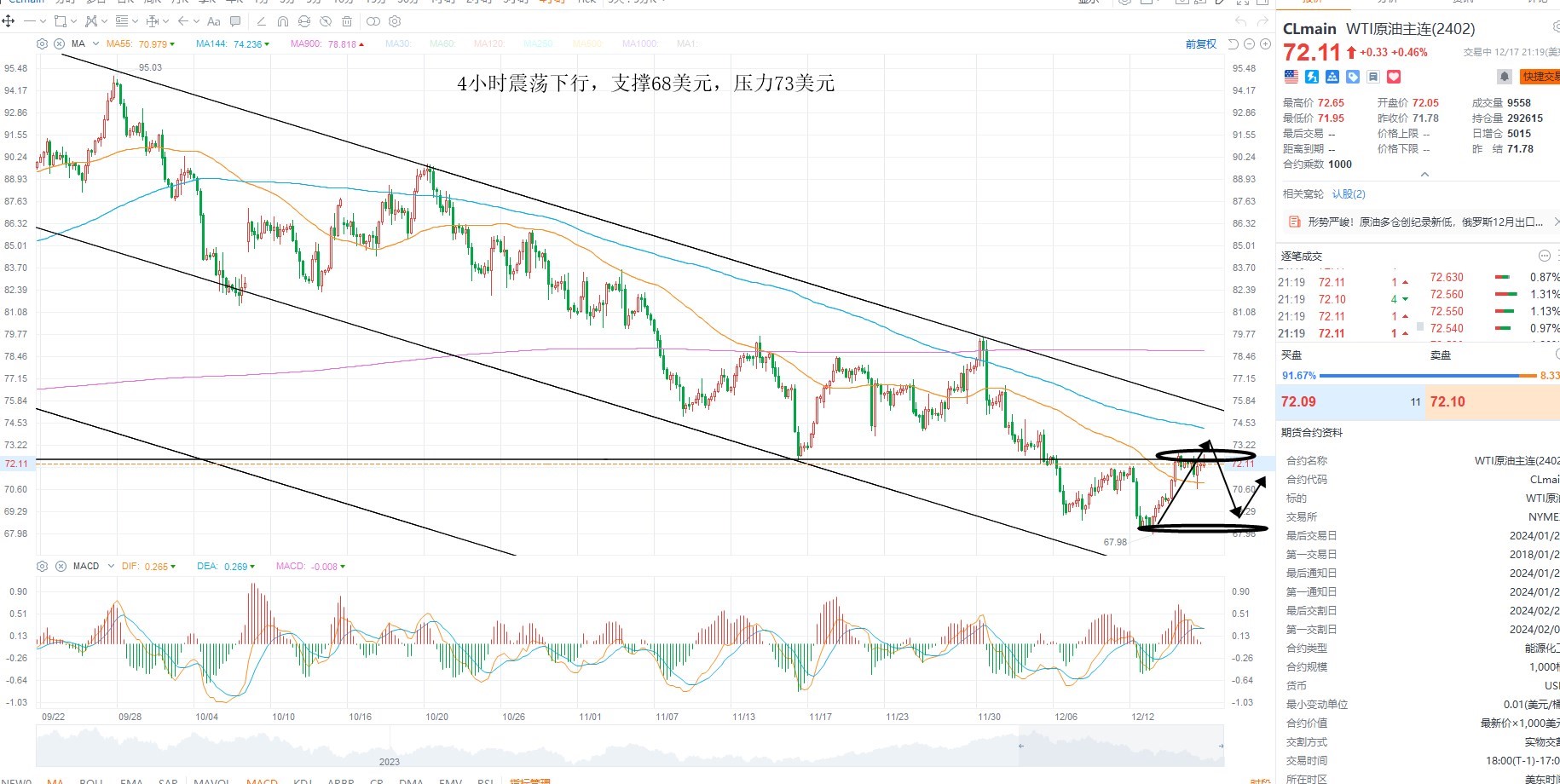 美原油超跌反弹,短期结构依然维持空头下行,主要是需求端压力依然是限制油价反弹的重要因素,同时库存数据上行,供需双杀之下,油价维持震荡下行,日内4小时级别多空分水岭73美元附近无法突破,则等待沽空机会,下方支撑68美元附近