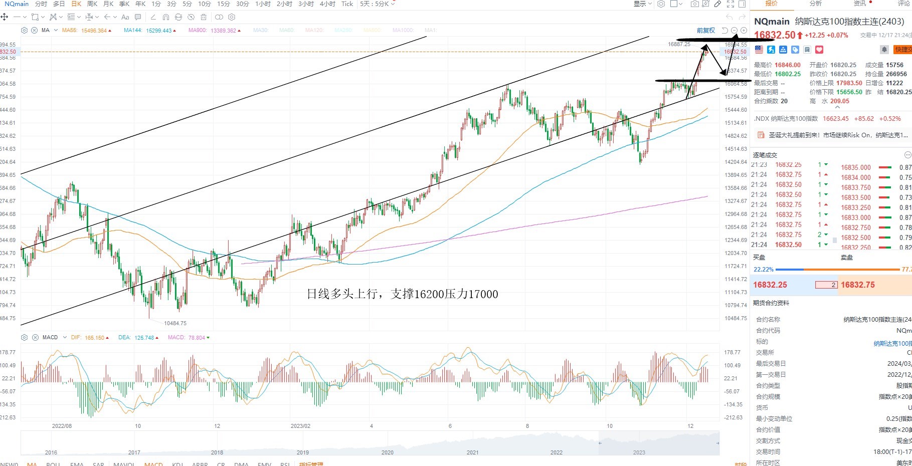 纳斯达克指数创历史新高之后继续维持震荡上行,但是多头动能明显减弱,目前需要等待均线上移之后的加速机会,这里的上行是分子端和分母端的共振,短期基本面上需要关注分子端业绩增速是否进一步支撑指数走强,日内回踩支撑16200附近低吸,上方压力17000整数关