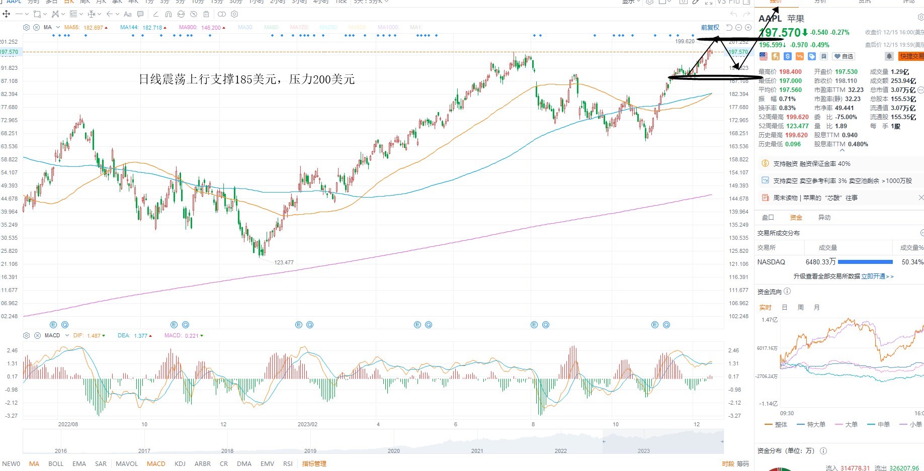 AAPL短期维持震荡上行,目前基本面上分子端业绩增速并未产生反转,所以即使指数新高,但并未能共振权重走高,短期等待回踩低吸,日线级别支撑185美元附近回踩不破,则维持震荡上行,上方压力200美元整数关