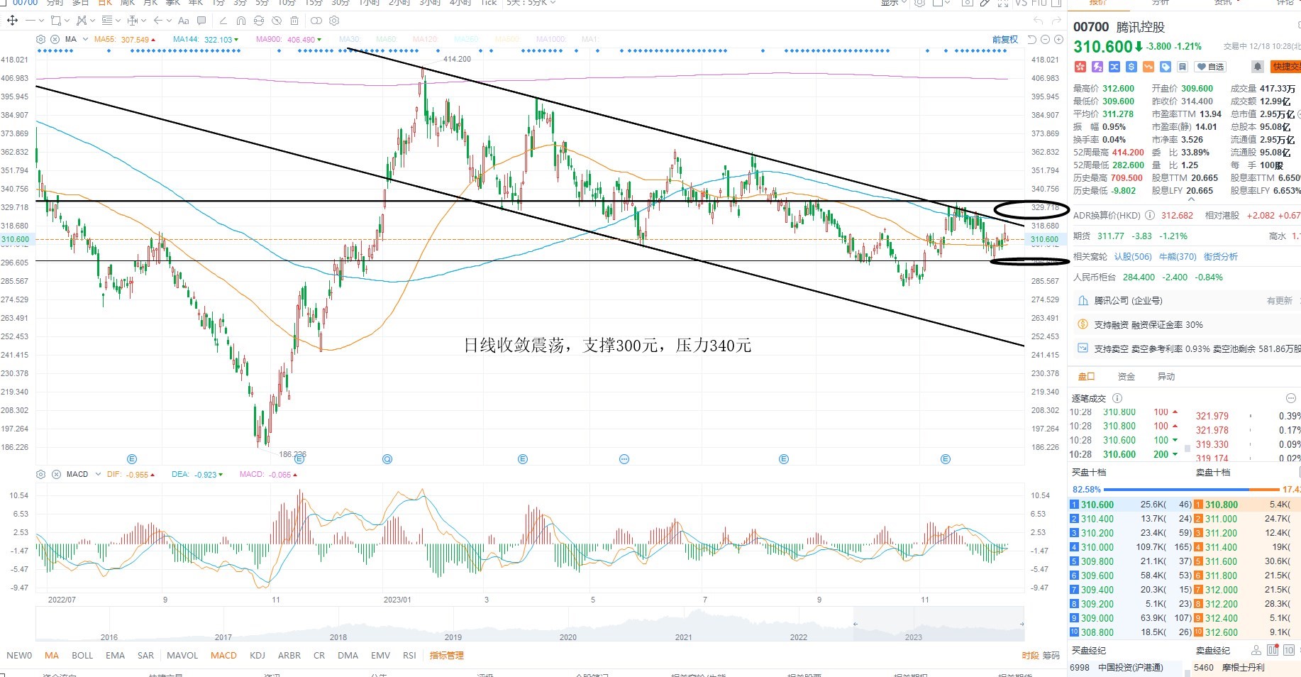 腾讯控股短期维持收敛震荡,基本面上需要等待权重共振之后的加速机会,同时指数若未能走出左侧区间,叠加流动性没有回暖之前,大概率继续震荡,日内回踩支撑300元附近低吸,上方压力340元突破则重返多头区间