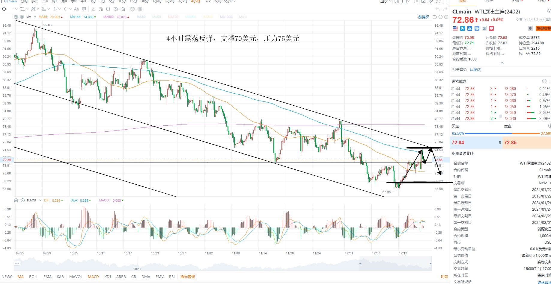 美原油超跌反弹,整体结构依然维持空头下行,且接近下降趋势线,短期等待压力测试之后的沽空机会为主,基本面上需求下行担忧情绪没有缓和之前,油价很难突破,本周继续关注库存数据的变化,4小时级别多空分水岭75美元附近,下方支撑70美元,跌破则不排除新低的可能性