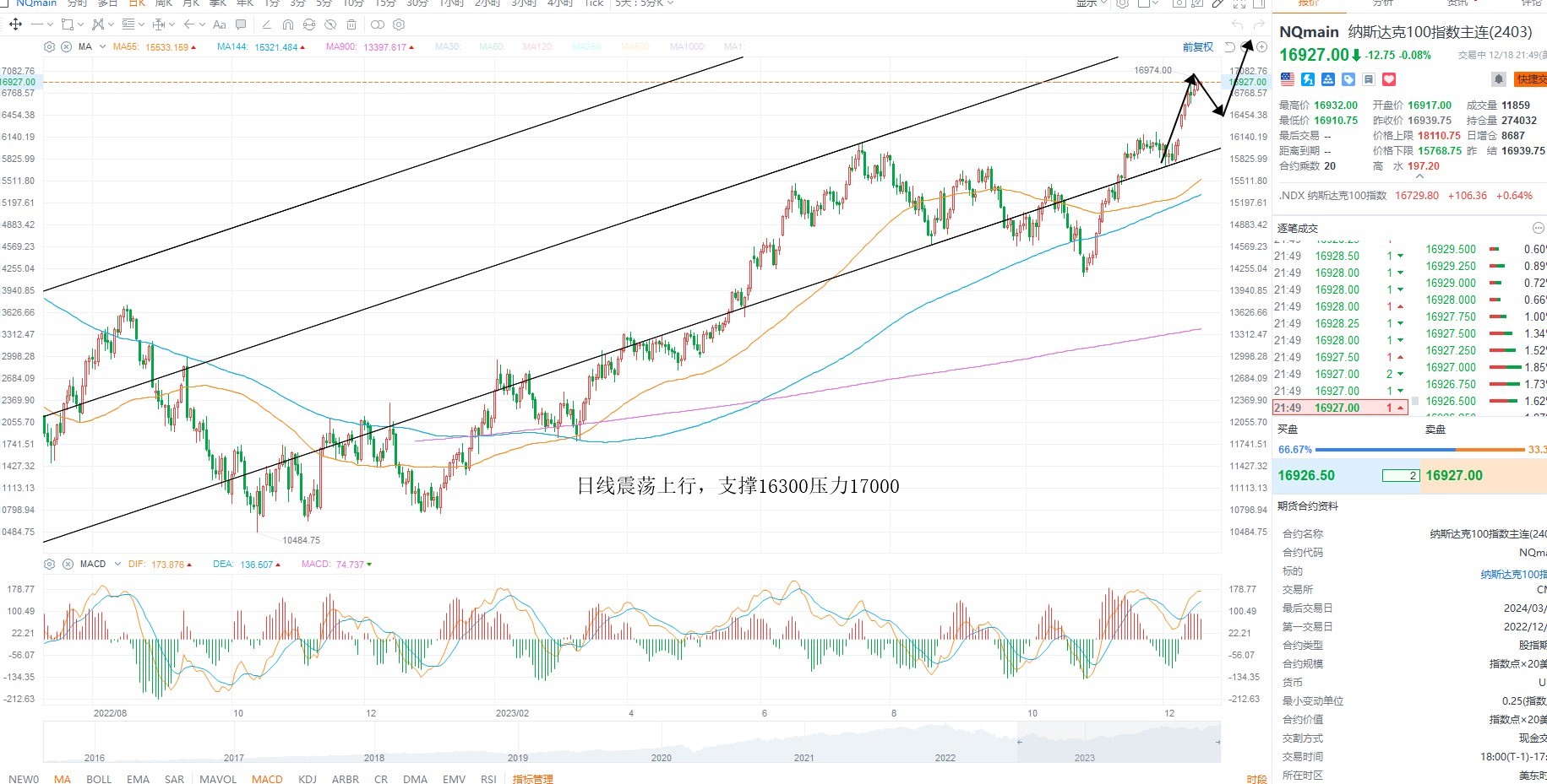 纳斯达克指数继续走强,短期并未加速,依然是震荡上行,目前对于分子端的业绩增速依然存在不确定性,所以权重没有共振之前,指数很难加速走高,谨防冲高回落,日内等待回踩低吸,下方支撑16300附近,上方压力17000附近