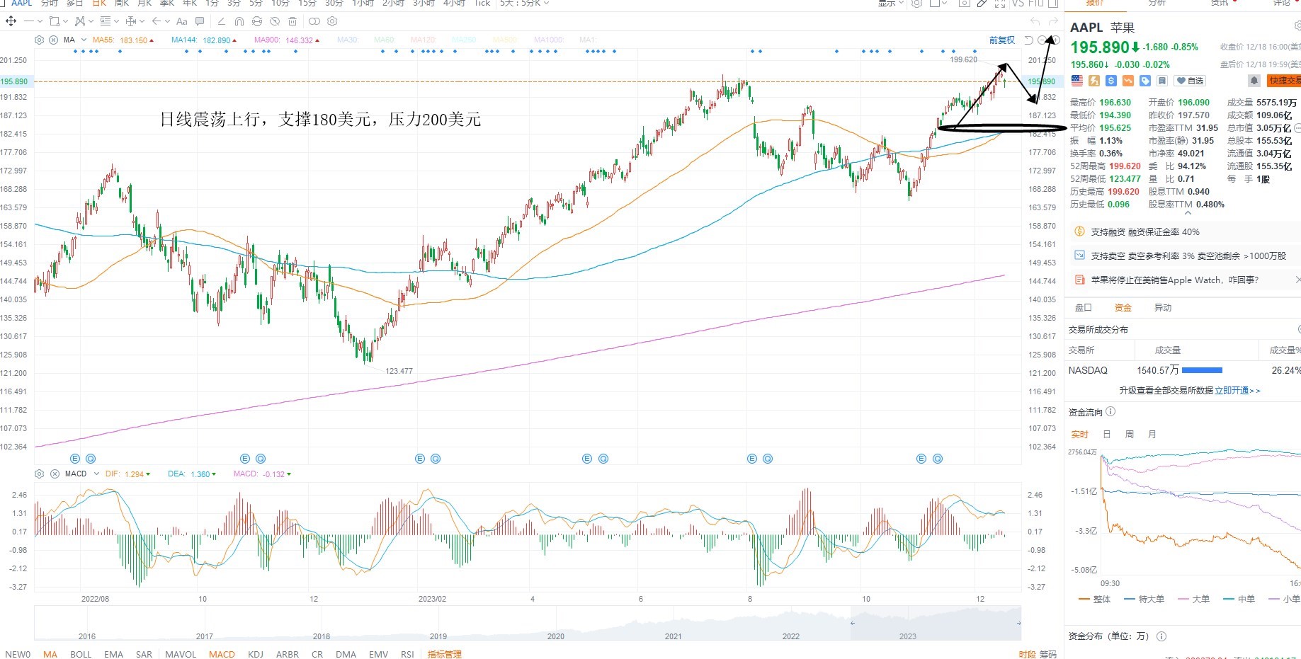 AAPL冲高回落,短期结构并未选择突破,且指数新高之后并未能加速权重共振,短期等待回踩为主,目前依然是受分子端业绩增速的下行而施压估值,日线级别回踩支撑180美元附近不破,则等待企稳低吸机会,上方压力200美元整数关