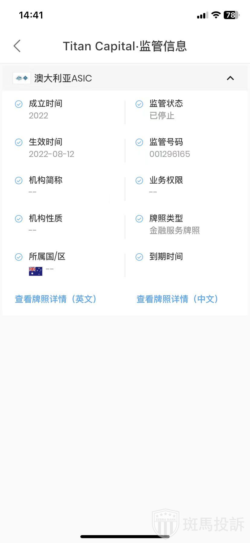 泰坦学院Titan Capital,在FxGecko显示1家监管信息。持有的澳大利亚ASIC 金融服务牌照监管状态为已停止。投资者资金安全无保障!