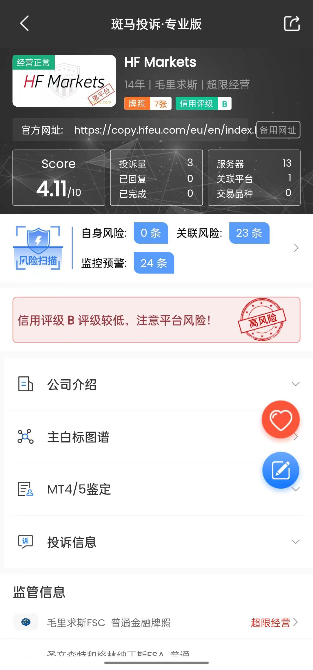 海投排行数据显示,HF Markets成立于2009年,目前拿到多张离岸牌照和FCA牌照,原来是叫Hot Markets,前几年退出中国,并且更改了名字,在中国市场一直不温不火,没有重金投入,也就是没有特别重视这个市场。断断续续一直在国内有所经营,但甚少有人进去投资,不知道为什么现在还有部分投资者选择这个平台。所以大家在选择平台的时候,不要光看这个平台有几张牌照,还要看这个平台的口碑和经营历史,如果不重视中国,在国内经常有纠纷,那大概率我们进去投资,也会遇到各种纠纷,得不偿失。前几天刚好跟大家说过银行原油宝案例,中国银行对客户进行了赔付,但是工商银行却让客户自己承担亏损,同样的理财产品由不同的银行来负责,带来的结果相差甚远。参考前文:《交易穿仓谁来赔?“原油宝”案例给大家两个参考》 海投Skype群链接:https://join.skype.com/vVpx5hsQdvO2