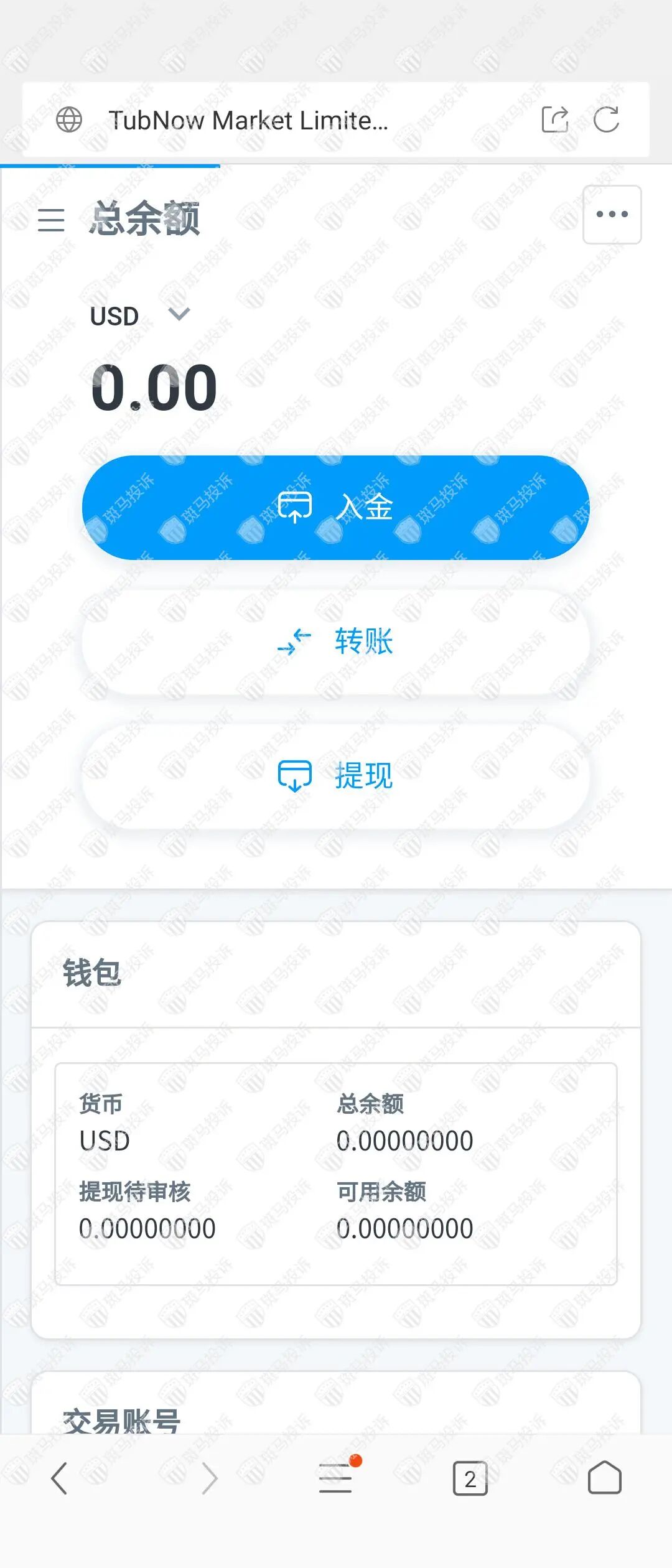 投资A反馈:刚开始接触股票,接到电话有人推荐购买股票,于是加入微信群QQ群先开始炒作股票。以温水煮青蛙的方式跟上操作在股市小赚一点博取信任!等行情不好转直播间唱双簧诱导到TubNow平台做外汇做比特币。等到提现的时候才发现是个杀猪盘!本人以上所说内容完全真实!