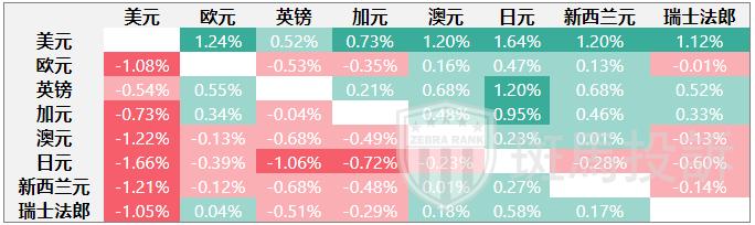热图显示了主要货币对的波动百分比变化。基准货币从左列中选取,报价货币从顶行中选取。例如,如果投资者从左列选择欧元,然后沿水平线移动到日元,方框中显示的百分比变化即为欧元/日元波动。