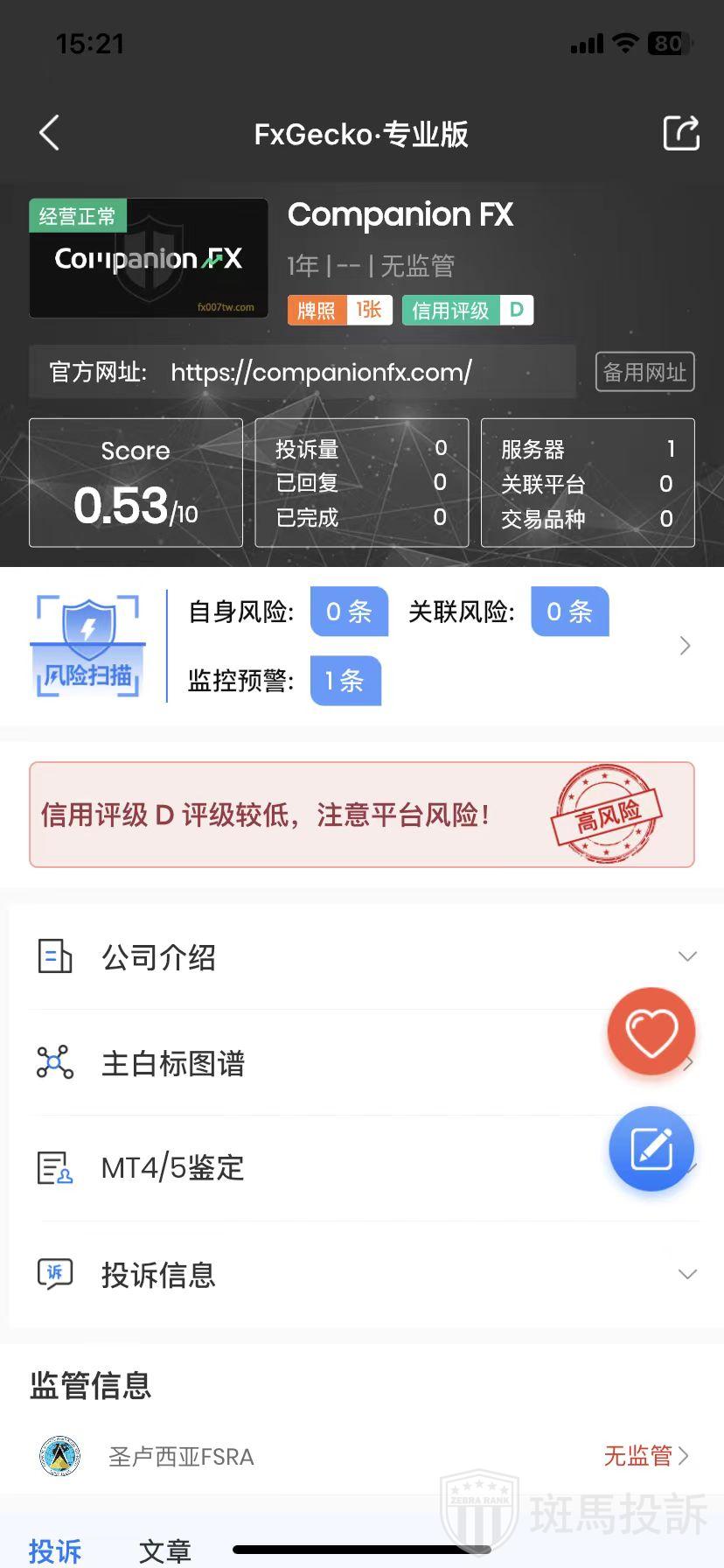 FxGecko风险提示:Companion FX外汇平台监控预警1条。注意提前预警!