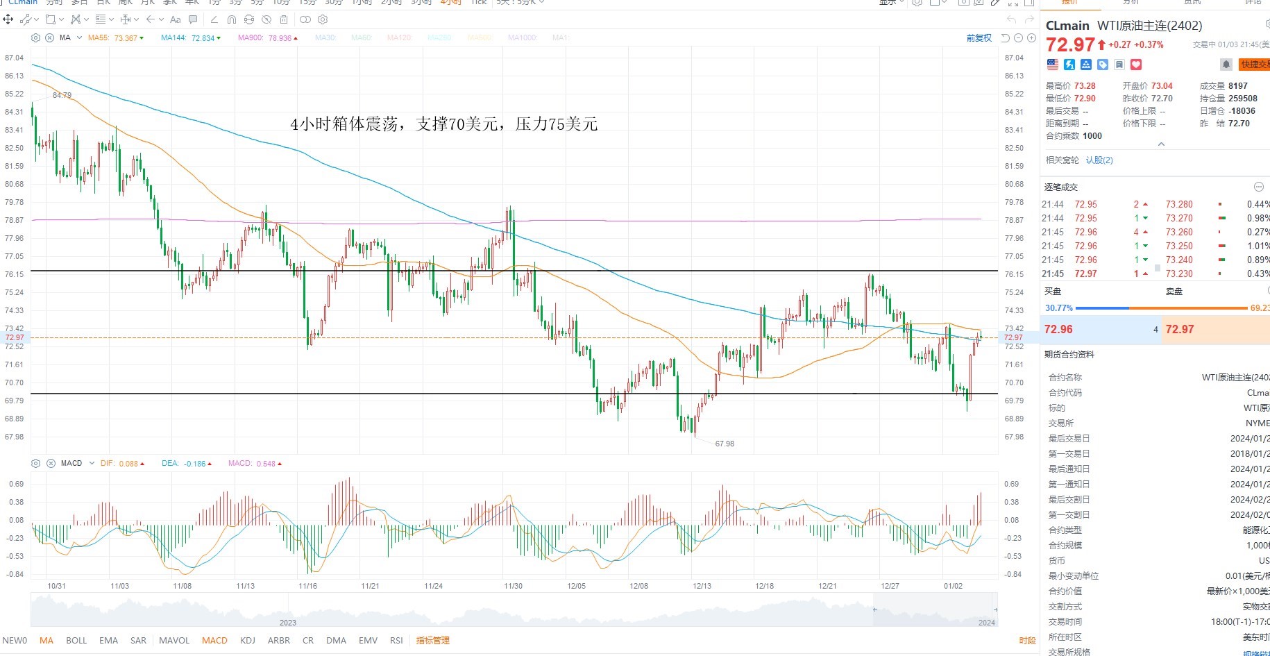 美原油维持箱体震荡,目前基本面上并未出现明显的变化,依然是需求担忧情绪压制油价走强,结构上没有突破箱体压力之前,高抛低吸为主,日内关注库存数据的变化,4小时级别支撑70美元附近,上方压力75美元