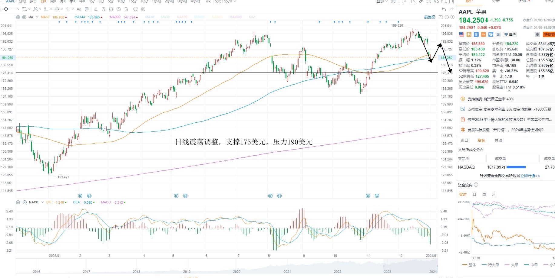 AAPL短期维持震荡调整,因指数冲高之后继续下行,且市场风偏进一步走弱,结构上不支持权重共振走强,日内维持空头对待,等待市场风偏进一步改善,日线级别支撑175美元附近,上方压力190美元附近