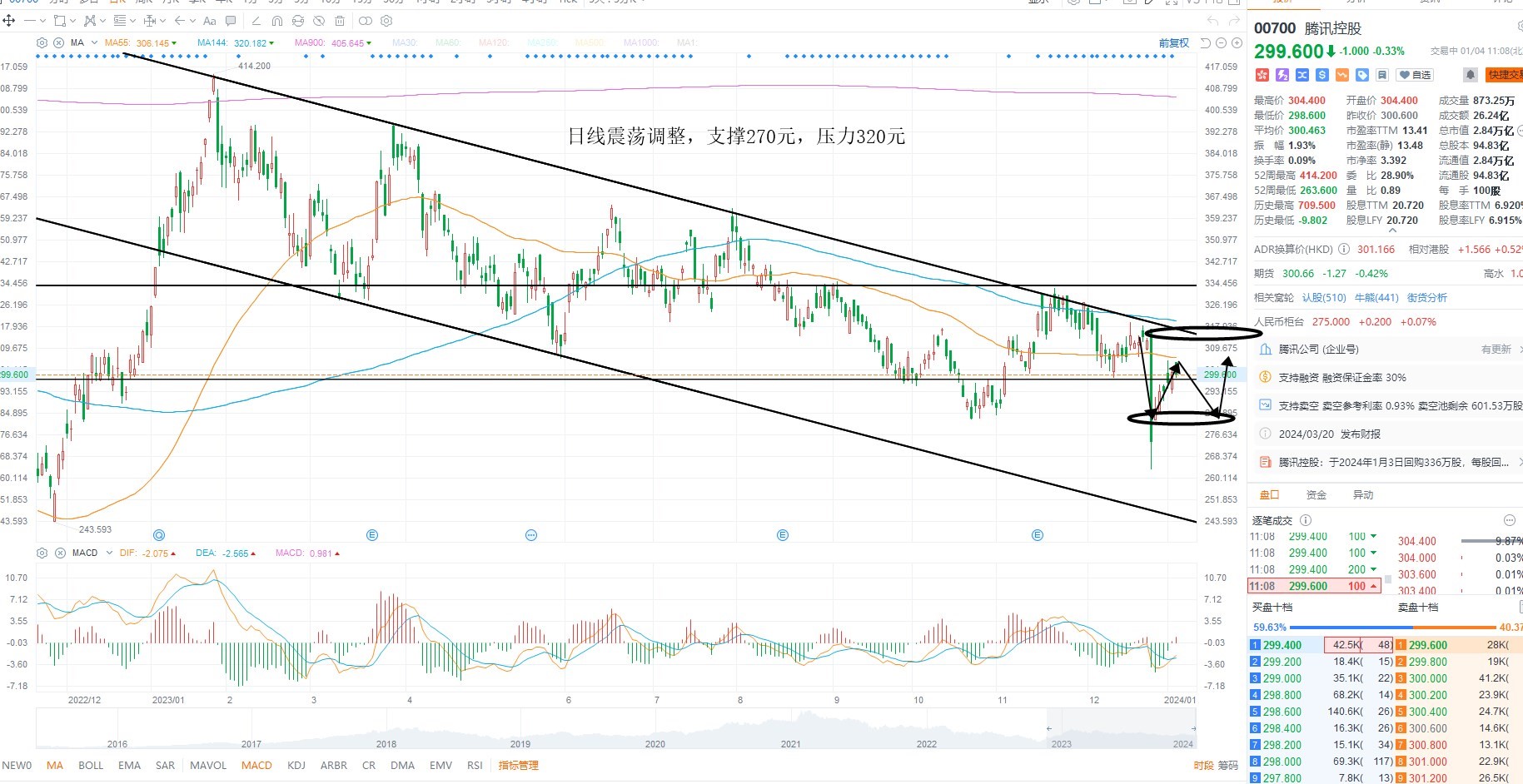 腾讯控股短期依然是调整结构,不过修复了此前的跌幅,目前进入压力测试区间,若指数无法进一步走强,则权重维持收敛的概率很大,日内等待方向选择为主,日线级别支撑270元附近,上方压力320元,突破则重返多头区间