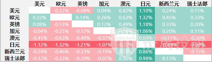 热图显示了主要货币对的波动百分比变化。基准货币从左列中选取,报价货币从顶行中选取。例如,如果投资者从左列选择欧元,然后沿水平线移动到日元,方框中显示的百分比变化即为欧元/日元波动。