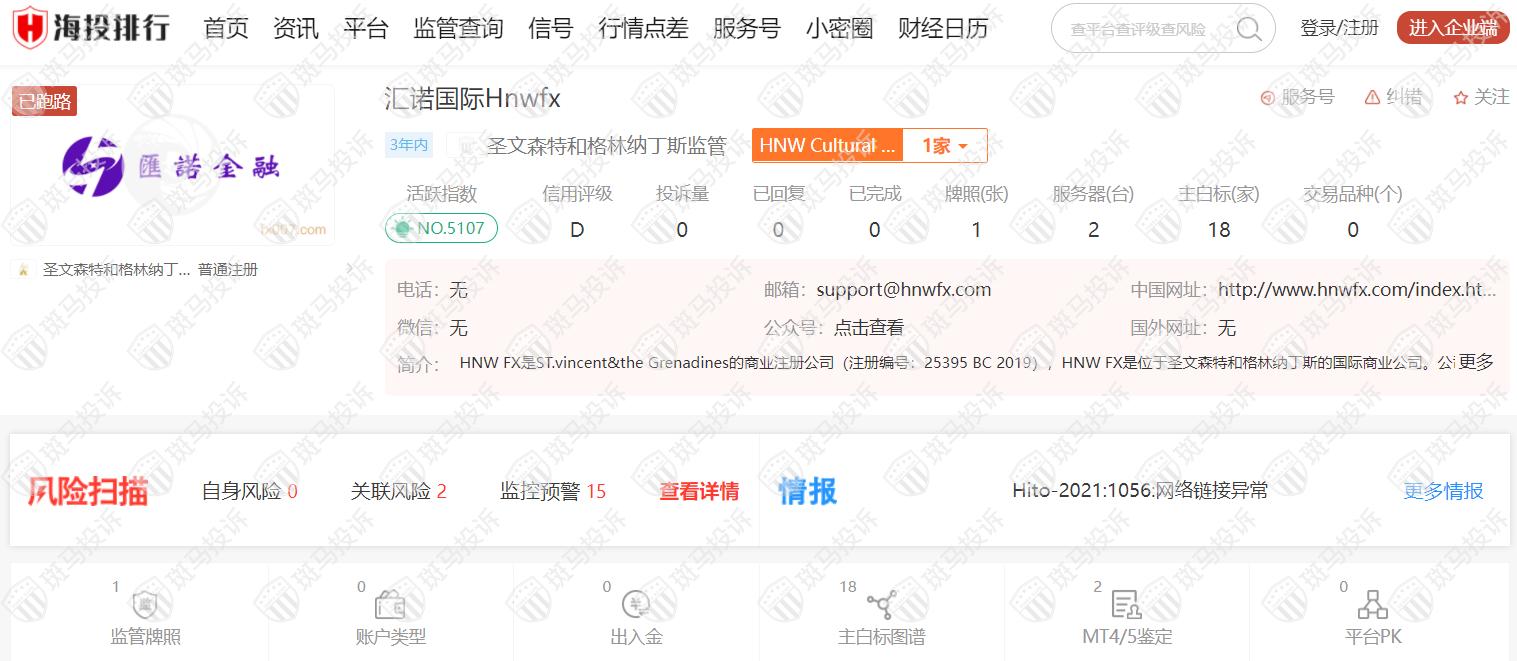 这家平台叫Hnwfx汇诺国际,成立于2019年,全球排名5107名,目前已跑路,由圣文森特和格林纳丁斯FSA监管,但属于超限经营,没有外汇牌照,不能做外汇保证金交易,风险扫描显示15条风险,投资者资金安全无保障。