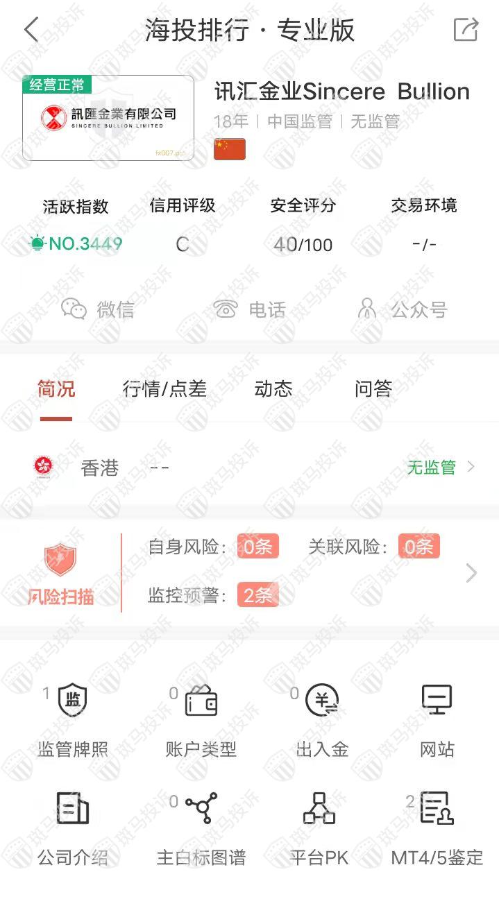 这家平台叫Sincere Bullion讯汇金业,成立于2004年,全球排名3449名,目前无监管,没有外汇牌照,不能做外汇保证金交易,风险扫描显示2条风险,投资者资金安全无保障。