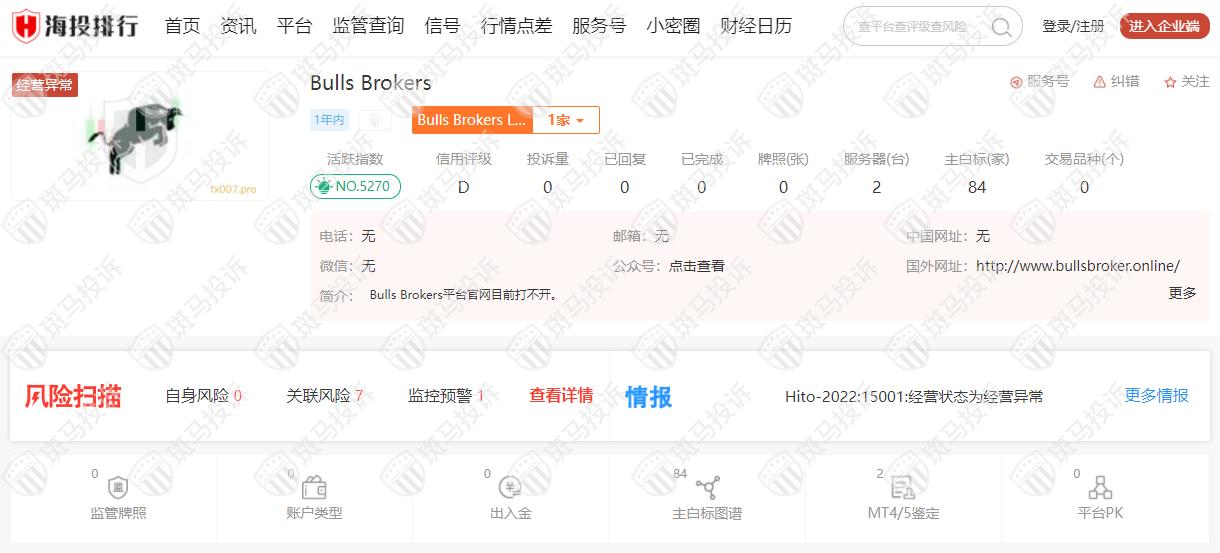 这家平台叫Bulls Brokers,成立于2022年,全球排名5269名,目前经营异常且无监管,没有外汇牌照,不能做外汇保证金交易,风险扫描显示8条风险,投资者资金安全无保障。