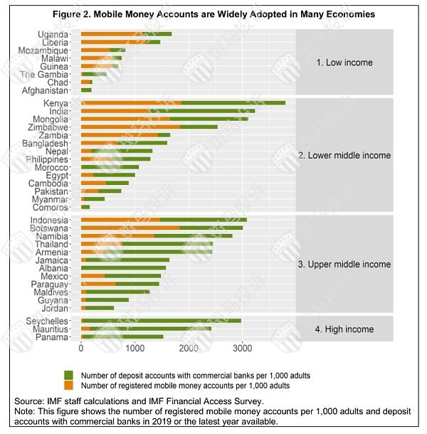 第二,移动货币成为一种流行的金融服务获取方式是毋庸置疑的,因为在某些中低收入国家,注册的移动货币账户超过了银行账户(图2)。这一趋势在低收入国家更为明显。在中等收入国家,移动货币似乎对商业银行提供的传统金融服务起到了补充作用。