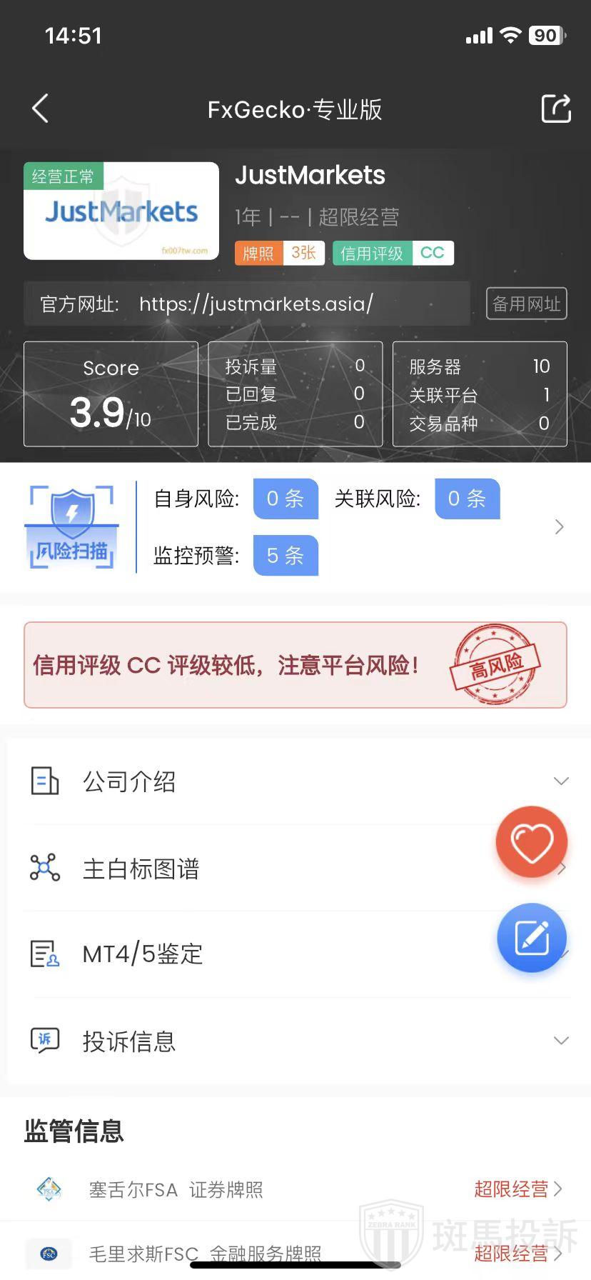 JustMarkets,FxGecko评分3.9分,信用评级较低,建议投资者远离!