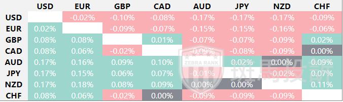 热图显示了主要货币之间的百分比变化。基础货币从左栏选取,而报价货币从顶行选取。例如,如果您从左栏中选择欧元,并沿着水平线移动到日元,则框中显示的百分比变化将表示欧元(基准)/日元(报价)。