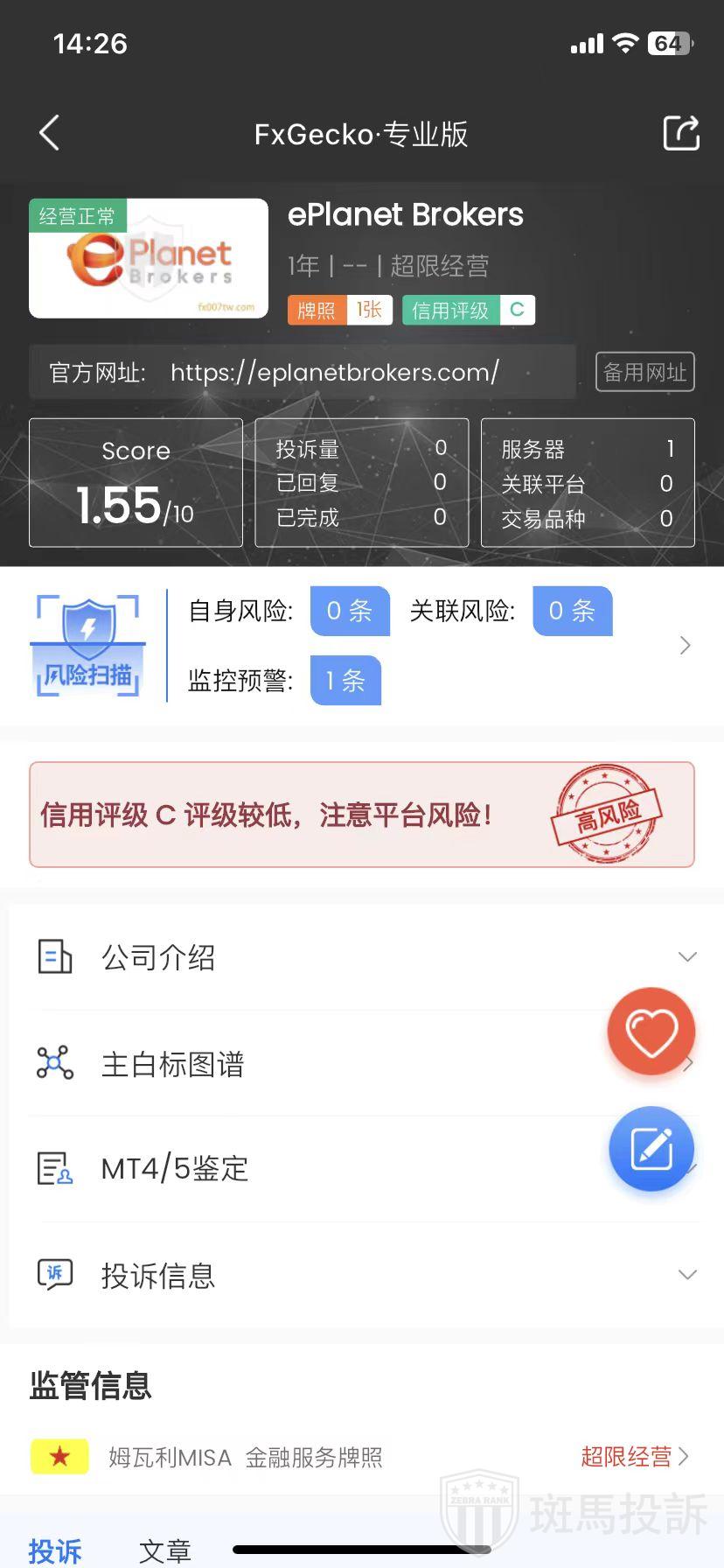 ePlanet Brokers,FxGecko评分1.55分,信用评级较低,建议投资者远离!