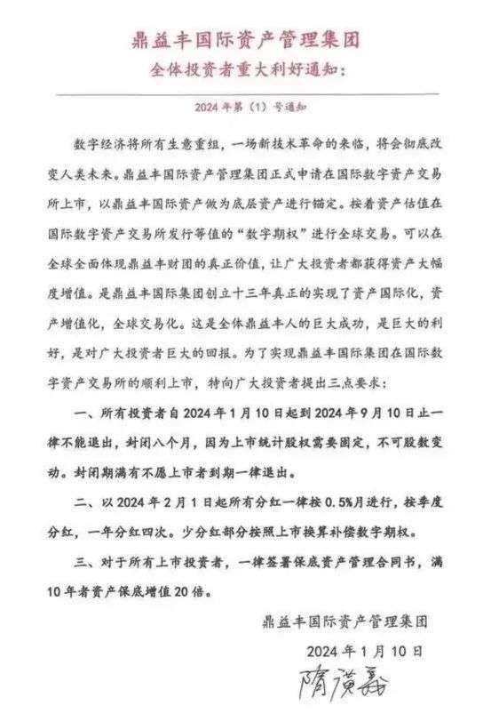 1月10日,鼎益丰发了一封针对投资者的公开信,标题是重大利好通知。