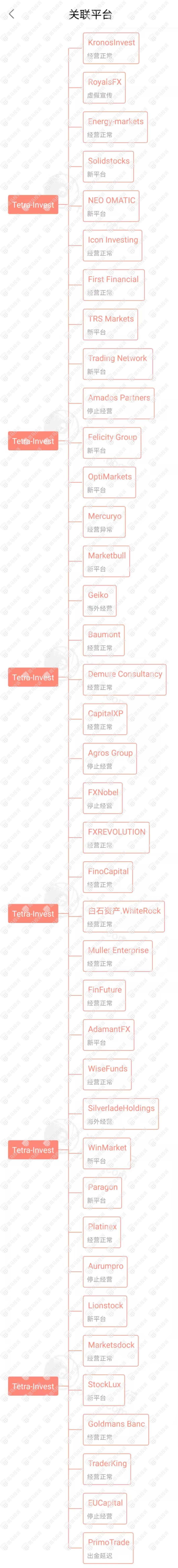 主白标关系显示,Tetra-Invest平台目前和39家平台存在关联,其中5家停止经营,2家海外运营,1家经营异常,1家出金延迟,1家虚假宣传。